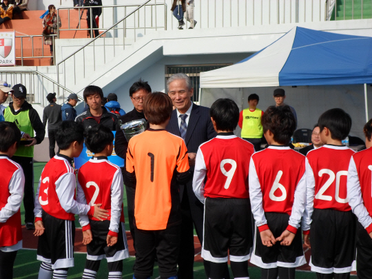 ◇김병목 영덕군수(가운데)가 지난 2월 경북 영덕군에서 개최된 유소년 축구대회에서 시상하고 있다. 사진제공=영덕군청