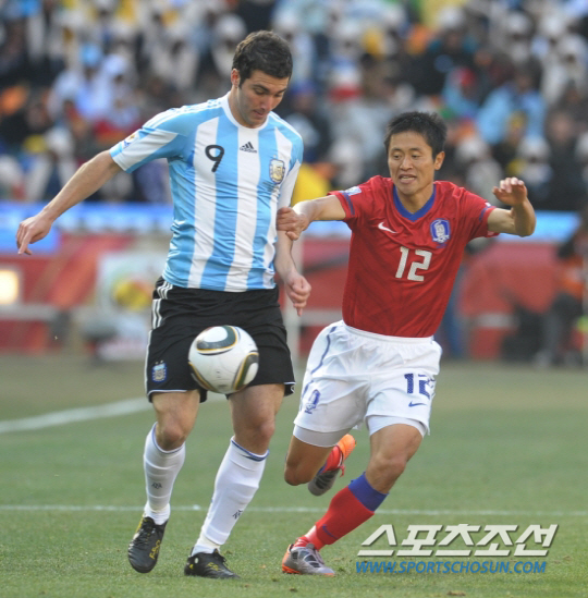 스포츠조선 2010년 6월 17일 2010 남아공월드컵 한국- 아르헨티나 17일 오후(한국시간) 남아공 요하네스버그에 위치한 사커시티 스타디움에서 열린 한국과 아르헨티나의 경기에서 한국 이영표와 아르헨티나 이과인이 볼을 다투고 있다. < 요하네스버그(남아공)= 김경민 기자 |