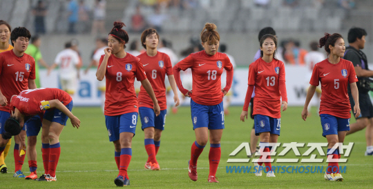 | ◇여자 대표팀 선수단이 24일 경기도 화성종합경기타운에서 가진 중국전에서 1대2로 패한 뒤 아쉬워 하며 그라운드를 떠나고 있다. 화성=허상욱 기자 wook@sportschosun.com |
