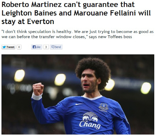 마르티네스 감독은 26일(한국시각) 영국 일간지 데일리미러를 통해 레이턴 베인스와 마루앙 펠라이니를 놓칠 수 있다고 밝혔다. 맨유는 현재 베인스 영입에 공을 들이고 있으며, 아스널은 펠라이니의 상황을 주시 중이다. 마르티네스 감독은 아직 이들에 대한 새로운 제안을 받지 못했지만, 더이상 막기 어려울수도 있다는 생각을 하고 있다.