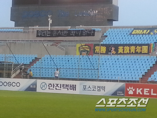 31일 K-리그 클래식 20라운드 전남 드래곤즈와 성남 일화전이 펼쳐진 전남 광양전용구장, 성남 원정 서포터석에 검은색 걸개가 내걸렸다. 치열한 맞대결을 앞두고 전운이 감돌았다.