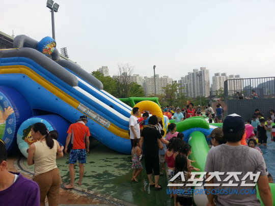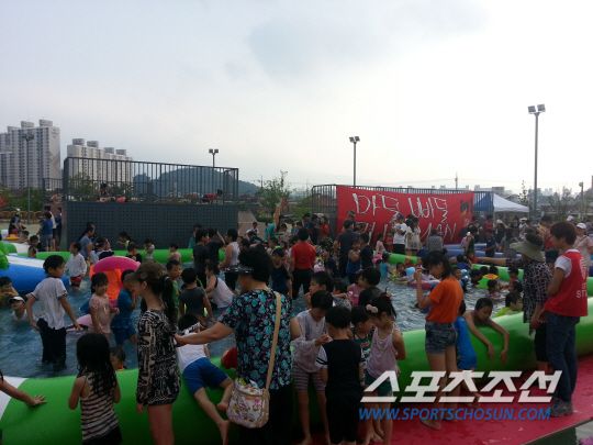 31일 경남-울산의 K-리그 클래식 20라운드가 펼쳐진 창원축구센터 앞. 인산인해(人山人海 )였다. 어린 아이와 어른을 불문하고 모두 물에 흠뻑 젖어 있었다. 도민구단 경남FC의 히트상품 '물놀이 키즈파크'를 이용하는 팬에게 더 이상 더위는 없었다.