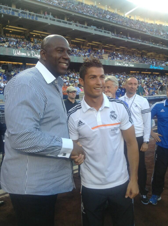 또 호날두는 시구 전 경기장을 찾은 미국 농구 스타 출신 LA다저스 부사장 매직 존슨과도 만나 악수를 하는 등 다정한 모습을 연출했다.