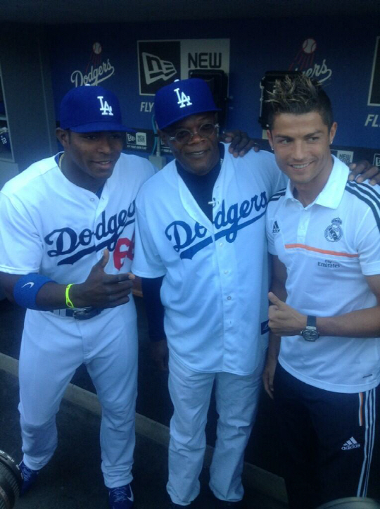 이날 다저스 공식 트위터에는 "세계적인 축구 스타 호날두가 다저스타디움을 찾았다"라는 글과 함께 사진이 게재됐다. 사진 속 호날두는 LA다저스 '쿠바 괴물' 야시엘 푸이그와 영화배우 사무엘 잭슨과 함께 엄지손가락을 치켜세운 채 사진 촬영에 여념이 없는 모습이다.