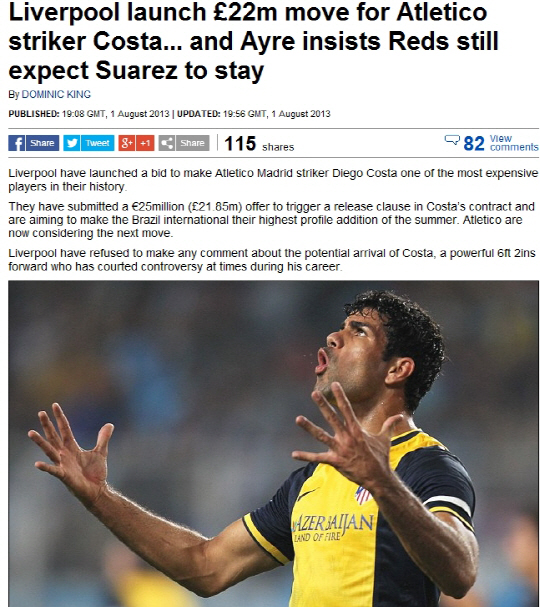 2일(한국시각) 영국 일간지 데일리메일은 리버풀이 코스타의 바이아웃 금액인 2500만유로를 아틀레티코 마드리드에 제시했다고 보도했다. 리버풀은 현재 코스타 영입에 대해 말을 아끼는 중이며, 아틀레티코 마드리드측은 고심을 거듭하고 있다. 만약 이번 이적이 성사된다면 코스타는 리버풀 역사상 역대 4번째로 비싼 선수가 된다.