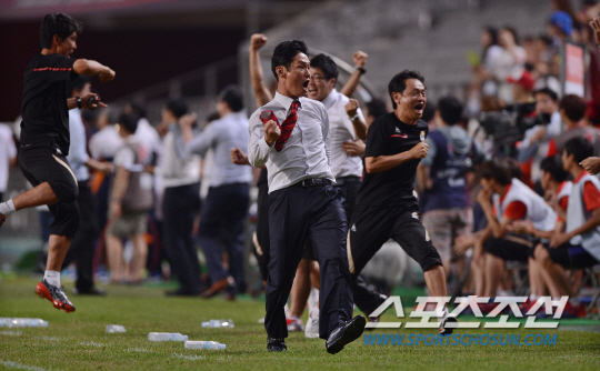31일 오후 서울 상암월드컵구장에서 2013 K리그 제주와 서울의 경기가 열렸다. 후반 추가시간에 제주 페드로의 페널티킥을 김용대 골키퍼가 막아내자 최용수 감독이 환호하고 있다. 김경민 기자 kyungmin@sportschosun.com / 2013.07.31.