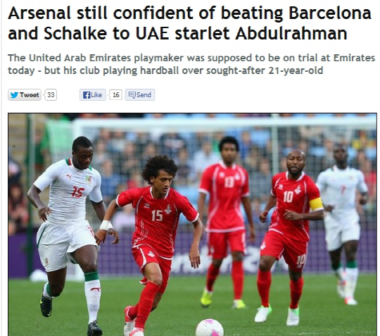 6일(한국시각) 영국 일간지 데일리미러는 빅클럽들이 알 아인의 미드필더 올마르 압둘라만 영입을 노리고 있다고 보도했다. 아랍에미리트 출신의 압둘라만은 지난 2012년 런던올림픽서 발군의 기량을 보이며 빅클럽들의 러브콜을 받았다. 바르셀로나, 도르트문트, 샬케, 발렌시아 등이 영입을 노렸다. 아스널은 그중에서도 가장 적극적인 행보를 보이고 있다.