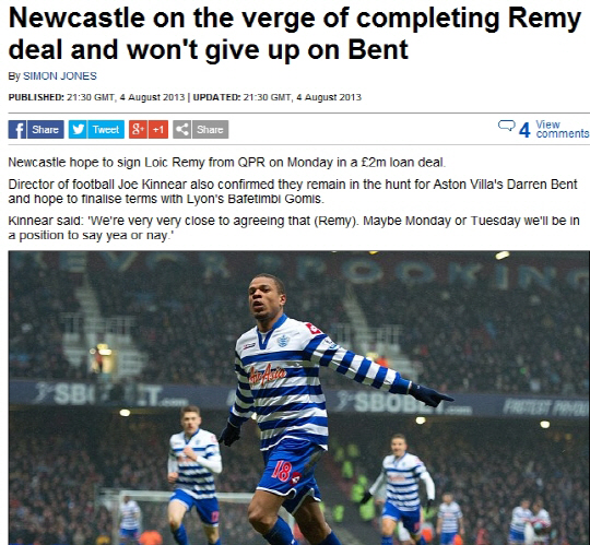 뉴캐슬은 리옹의 프랑스국가대표 출신 공격수 바페팀비 고미스 영입에 성공했다. 그러나 이에 만족하지 않았다. 추가 영입이 조만간 이어질 것으로 보인다. 5일(한국시각) 영국 일간지 데일리미러는 뉴캐슬이 퀸즈파크레인저스로부터 로익 레미 임대 영입을 앞두고 있다고 보도했다. 뉴캐슬의 기술이사 조 키니어는 "우리는 레미 임대 영입에 매우 근접했다"고 했다.