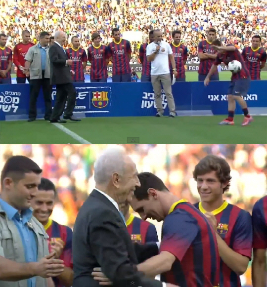 바르셀로나와 함께 이스라엘을 방문한 리오넬 메시가 이스라엘 대통령의 시축에 배를 맞으며 웃음을 선사했다.