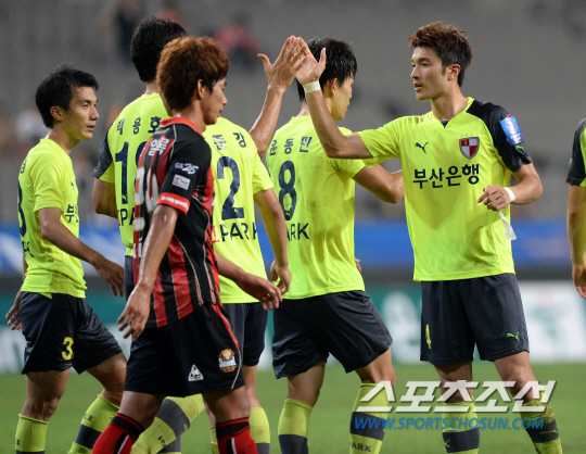 FC서울과 부산 아이파크의 2013 하나은행 FA컵 8강전 경기가 7일 서울월드컵경기장에서 열렸다. 2대1로 승리하며 FA컵 4강에 진출한 부산 선수들이 기쁨을 나누고 있다. 상암=허상욱 기자 wook@sportschosun.com/2013.08.07/