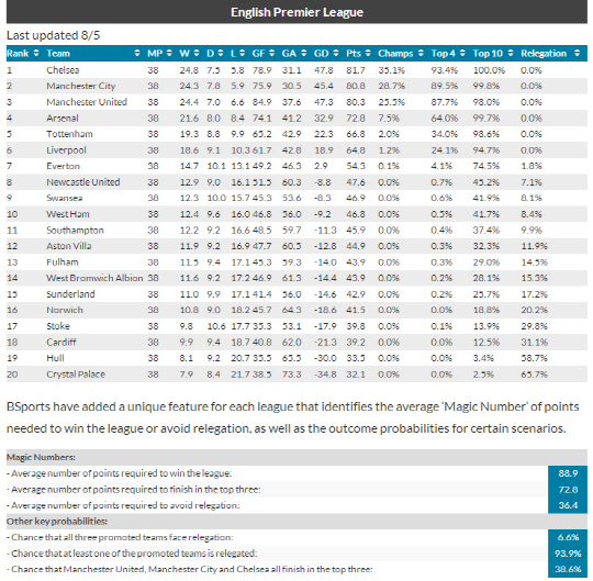 2013~2014 시즌 잉글랜드 프리미어리그 우승을 첼시가 차지할 것이라고 미국의 유력 스포츠 통계 매체가 내다봤다.