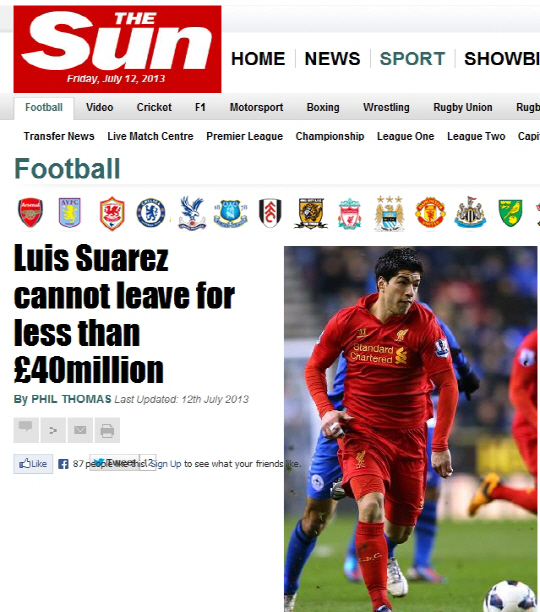 헨리 구단주는 라이벌 아스널에 수아레스를 넘겨주는 것은 "우스꽝스럽다"고 했다. 아스널은 수아레스 이적을 위해 리버풀에 두 차례 제안을 했지만, 모두 거절당했다. 최근 4000만파운드(약 691억원)까지 몸값을 올렸지만, 리버풀은 고개를 저었다.