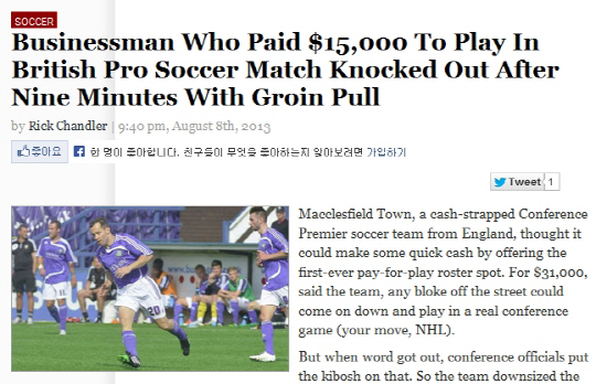 9일(한국시각) 스포츠 전문매체 스포츠그리드닷컴은 '일반 회사원인 제임스 고핀(40)이 8일 잉글랜드 5부 리그 메이클즈필드와 프리미어리그 스토크시티의 친선경기에 출전하기 위해 1만5000달러(약 1600만원)을 지불했다'고 보도했다.
