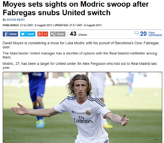 이 가운데 세스크 파브레가스가 최근 바르셀로나 잔류 의사를 밝히면서 모예스 감독이 모드리치로 급하게 방향을 선회한 것으로 보인다. 지난 시즌 모드리치는 3300만파운드를 받고 레알 마드리드의 유니폼을 입었지만 맨유는 그의 영입에 2500만파운드가 들 것으로 예상하고 있다.