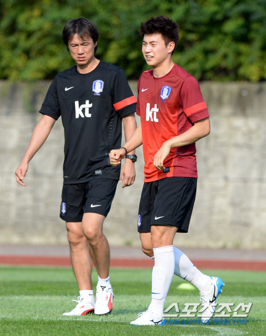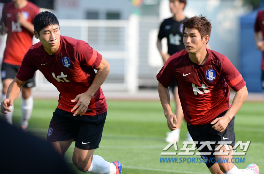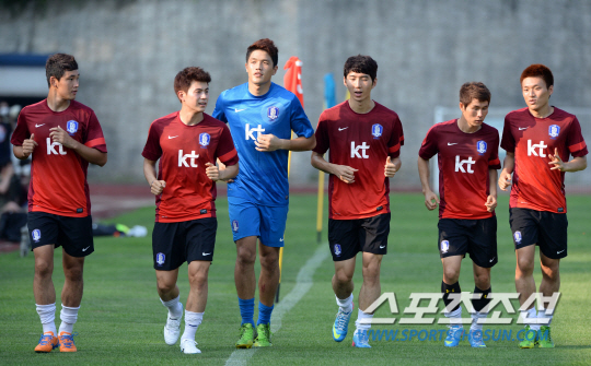 이날 훈련은 무더운 날씨 탓에 오후 5시부터 진행됐다. 태극전사들은 홍 감독과 1분간 짧은 미팅을 갖은 뒤 훈련에 돌입했다. 선수들이 가벼운 스트레칭으로 몸을 풀자 홍 감독은 곧바로 각 포지션별로 두 명씩 세워 공간과 위치 이동에 따른 조직력을 가다듬었다. 최전방 공격에는 김동섭과 조동건이 섰다. 골 가뭄을 풀 2선 공격진에는 왼쪽 측면에 윤일록(서울)과 임상협이, 오른쪽 측면에는 이근호(상주)와 조찬호(포항)이 배치됐다. 섀도 스트라이커에는 백성동(주빌로)와 이승기(전북)이 낙점됐다.