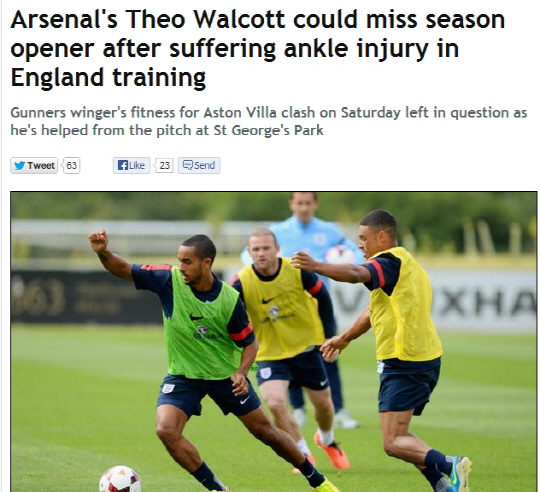 13일(한국시각) 영국 일간지 데일리미러는 시오 월컷이 부상으로 시즌 개막전에 결장할 가능성이 높다고 보도했다. 월컷은 스코틀랜드와의 친선경기를 앞두고 대표팀에 차출됐다. 그는 21세 이하 선수들과 함께 훈련하던 도중 발목 부상으로 쓰러졌다. 월컷은 대표팀 경기는 물론 애스턴빌라와의 개막전에도 출전하지 못할 것으로 보인다. 로이 호지슨 잉글랜드 대표팀 감독은 "월컷은 현재 괜찮다. 경미한 충돌이 있었다"고 했다.