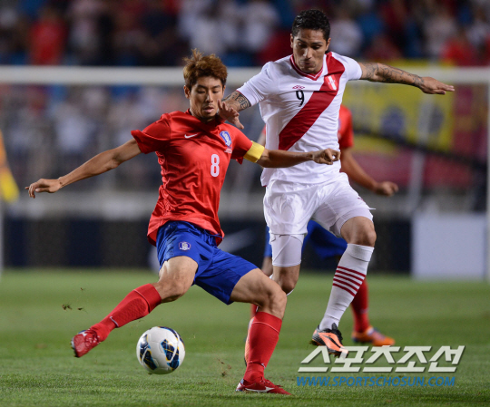 14일 오후 수원월드컵구장에서 축구 국가대표팀 친선경기 한국과 페루의 경기가 열렸다. 한국 하대성이 페루 파올로와 볼을 다투고 있다.