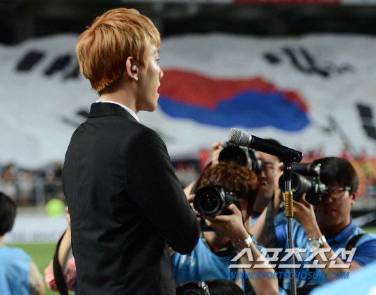 홍명보 감독이 이끄는 축구대표팀이 14일 수원월드컵경기장에서 페루와 친선 경기를 했다. 그룹 EXO 백현이 애국가를 부르고 있다.