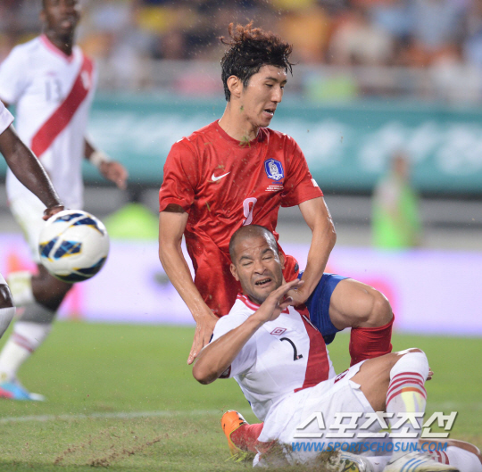홍명보 감독이 이끄는 한국 축구대표팀이 14일 저녁 수원 월드컵경기장에서 페루를 상대로 친선경기를 펼쳤다. 한국의 김동섭이 페루 수비수가 문전에서 볼경합을 벌이고 있다.