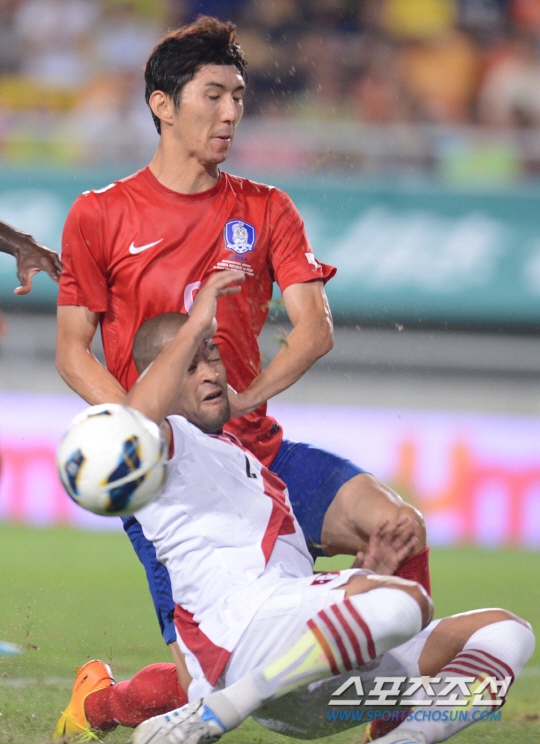 홍명보 감독이 이끄는 한국 축구대표팀이 14일 저녁 수원 월드컵경기장에서 페루를 상대로 친선경기를 펼쳤다. 한국의 김동섭이 페루 수비수가 문전에서 볼경합을 벌이고 있다.
