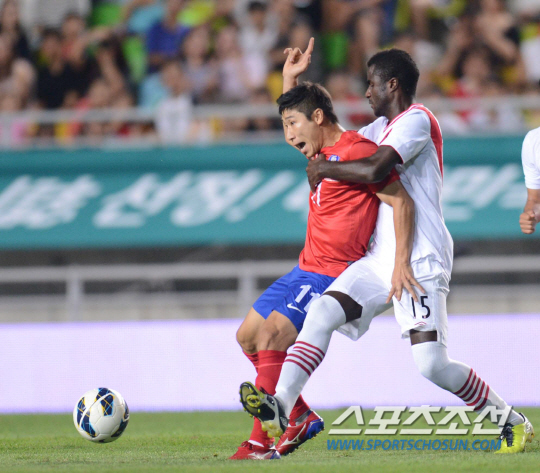 홍명보 감독이 이끄는 한국 축구대표팀이 14일 저녁 수원 월드컵경기장에서 페루를 상대로 친선경기를 펼쳤다. 한국의 이근호가 페루 크리스티안 라모스와 볼경합을 벌이고 있다.