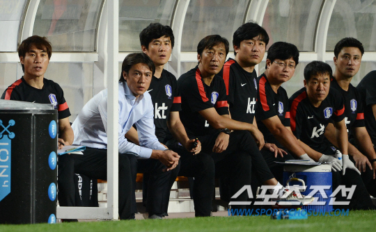 홍명보 감독이 이끄는 축구대표팀이 14일 수원월드컵경기장에서 페루와 친선 경기를 했다. 홍명보 감독이 벤치에 앉아 경기를 지켜보고 있다.