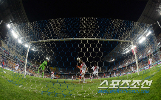 홍명보 감독이 이끄는 축구대표팀이 14일 수원월드컵경기장에서 페루와 친선 경기를 했다. 한국팀의 슈팅이 골키퍼를 제쳤지만 뒤에 있던 페루 수비수가 헤딩으로 걷어내고 있다.