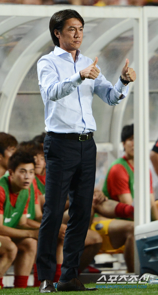 홍명보 감독이 이끄는 축구대표팀이 14일 수원월드컵경기장에서 페루와 친선 경기를 했다. 홍명보 감독이 과감한 중거리 슈팅에 엄지를 들어보이고 있다.