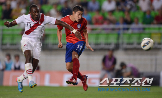 14일 오후 수원월드컵구장에서 축구 국가대표팀 친선경기 한국과 페루의 경기가 열렸다. 한국 이근호가 페루 루이스의 마크를 넘어 헤딩슛을 시도하고 있다.