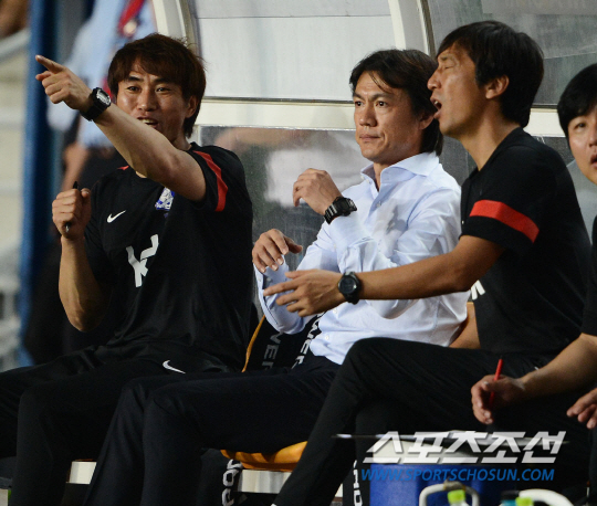 홍명보 감독이 이끄는 축구대표팀이 14일 수원월드컵경기장에서 페루와 친선 경기를 했다. 홍명보 감독과 코치들이 골이 안 들어가자 탄식하고 있다.