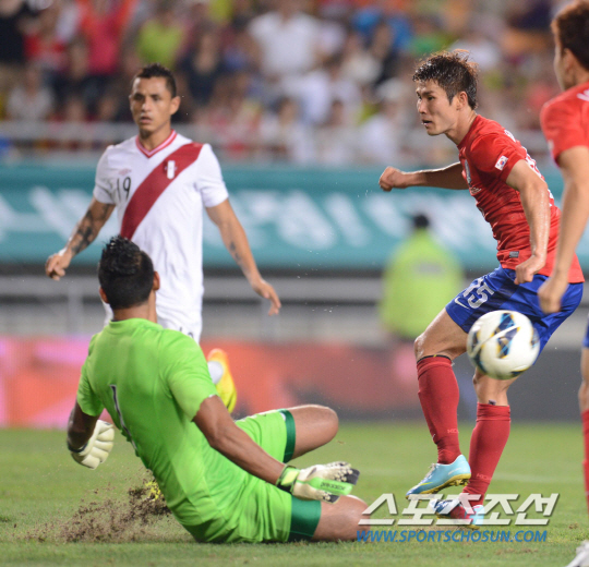 홍명보 감독이 이끄는 한국 축구대표팀이 14일 저녁 수원 월드컵경기장에서 페루를 상대로 친선경기를 펼쳤다.한국 조찬호의 왼발 슈팅이 페루 골키퍼의 선방에 막혀 노골이 되었다.