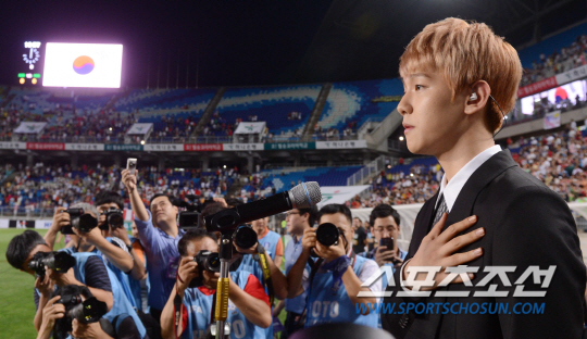 홍명보 감독이 이끄는 한국 축구대표팀이 14일 저녁 수원 월드컵경기장에서 페루를 상대로 친선경기를 펼쳤다. 경기전 그룹 EXO의 백현이 애국가를 제창하고 있다.