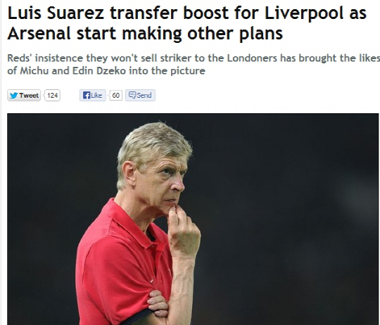 14일(한국시각) 영국 일간지 데이리미러는 아르센 벵거 아스널 감독이 여전히 최우선 영입 목표로 수아레스를 원하고 있지만, 실패할 경우에 대비해서 스완지시티의 미추나 맨시티의 에딘 제코로 눈길을 돌리고 있다고 보도했다. 아스널은 올여름 내내 특급 공격수 보강에 열을 올려왔다. 곤살로 이과인(나폴리), 웨인 루니(맨유)에 이어 수아레스가 최종낙점됐다. 그러나 리버풀의 저항이 만만치 않다. 아스널은 마지막으로 4000만1파운드보다 향상된 금액을 제시할 예정이지만 리버풀이 받아들일지 미지수다.