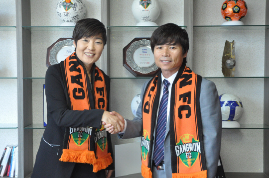 | ◇김용갑 강원 신임 감독(오른쪽)이 14일 감독 선임 후 임은주 강원 대표이사와 손을 맞잡고 있다. 사진제공=강원FC |