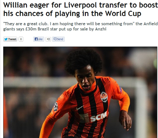16일(한국시각) 영국 일간지 데일리메일은 데이비드 모예스 감독이 브라질 출신의 공격형 미드필더 윌리안(안지) 영입을 노리고 있다고 보도했다. 데일리메일에 따르면 맨유는 윌리안의 영입을 위해 3000만파운드를 준비한 것으로 알려졌다. 윌리안은 이적시장 막바지 최대어 중 하나다. 리버풀과 토트넘도 관심을 보이고 있다. 리버풀이 한발 앞서 있는 가운데, 맨유가 하이재킹을 시도하고 있는 양상이다. 가레스 베일이 떠날 경우에 대비해 윌리안을 노리고 있는 토트넘도 상황을 주시 중에 있다. 일단 윌리안은 잉글랜드행에 긍정적인 반응이다. 그는 "잉글랜드는 내 목표다. 나는 잉글랜드 프리미어리그를 좋아한다. 만약 잉글랜드에서 뛴다면 나와 내 이미지에 큰 도움이 될 것이다"고 했다.