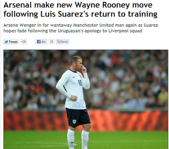 17일(한국시각) 영국 일간지 데일리미러는 루이스 수아레스 영입에 실패한 아스널이 루니 영입으로 급선회했다고 보도했다. 수아레스는 클럽에 사과한 후 리버풀 훈련에 참가했다. 여름 내내 수아레스 영입을 노린 아스널 입장에서는 난감한 상황이다. 아스널은 올여름 월드클래스 선수 영입을 공언했지만, '유망주' 야야 사노고 한명만 영입했을 뿐이다. 많은 기대를 했던 팬들이 불만을 나타내고 있다. 아스널은 루니 카드로 반전에 나섰다. 데일리미러에 따르면 아스널의 최고 경영자 이반 가지디스가 이미 맨유측과 접촉을 한 것으로 알려졌다.