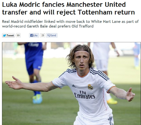 데이비드 모예스 맨유 감독은 올여름 선수영입에 있어 도통 재미를 보지 못하고 있다. 처음부터 노려운 세스크 파브레가스는 사실상 영입이 어려운 상태다. 에버턴서 함께 한 마루앙 펠라이니 영입도 쉽지 않다. 맨유의 수뇌부는 최근 마드리드로 건너가 일부 선수들과 접촉한 것으로 알려졌다. 메주트 외칠이 대상자였다는 보도가 이어지는 가운데 모드리치와 대화를 나눴을수도 있다.
