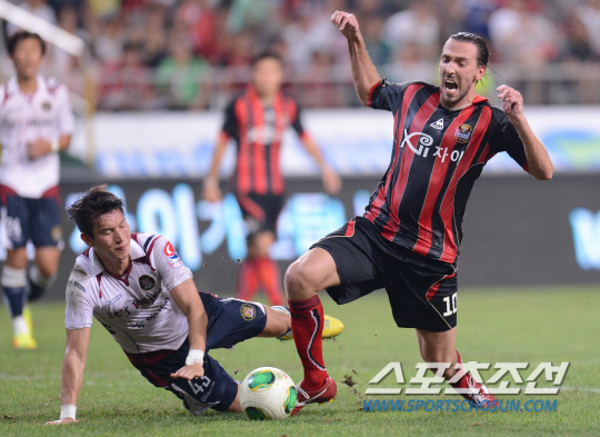 FC 서울이 15일 서울월드컵경기장에서 리그 최하위인 대전 시티즌를 상대로 K리그 클래식 23라운드 경기를 벌였다. FC서울 데얀이 대전 시티즌 이강진과 치열한 볼경합을 벌이고 있다. 상암=최문영 기자 deer@sportschosun.com