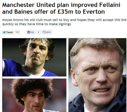 21일(이하 한국시각) 영국 일간지 데일리미러는 맨유가 펠라이니와 베인스 영입을 위해 3500만파운드를 제시할 예정이라고 보도했다. 당초 제시한 2800만파운드보다 향상된 금액이다. 에버턴은 맨유의 첫번째 제시액을 듣고 황당함을 넘어 분노의 반응을 보인 바 있다. 일단 맨유의 향상된 제시액에도 불구하고 에버턴은 "시간 낭비일뿐"이라며 무시하고 있다.