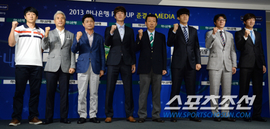 2013 하나은행 FA컵 준결승 미디어데이가 21일 서울 신문로 축구회관에서 열렸다. 이번 FA컵 4강전 대진은 결승행 티켓을 놓고 제주와 포항, 부산과 전북이 맞대결을 펼치게 됐다. FA컵 4강에서 맞붙게 될 4팀의 감독과 대표선수들이 포즈를 취했다. 왼쪽부터 제주 박경훈 감독과 오승범, 부산 윤성효 감독과 이창근, 전북 최강희 감독과 정인환, 포항 황선홍 감독과 고무열. 허상욱 기자 wook@sportschosun.com/2013.08.21/