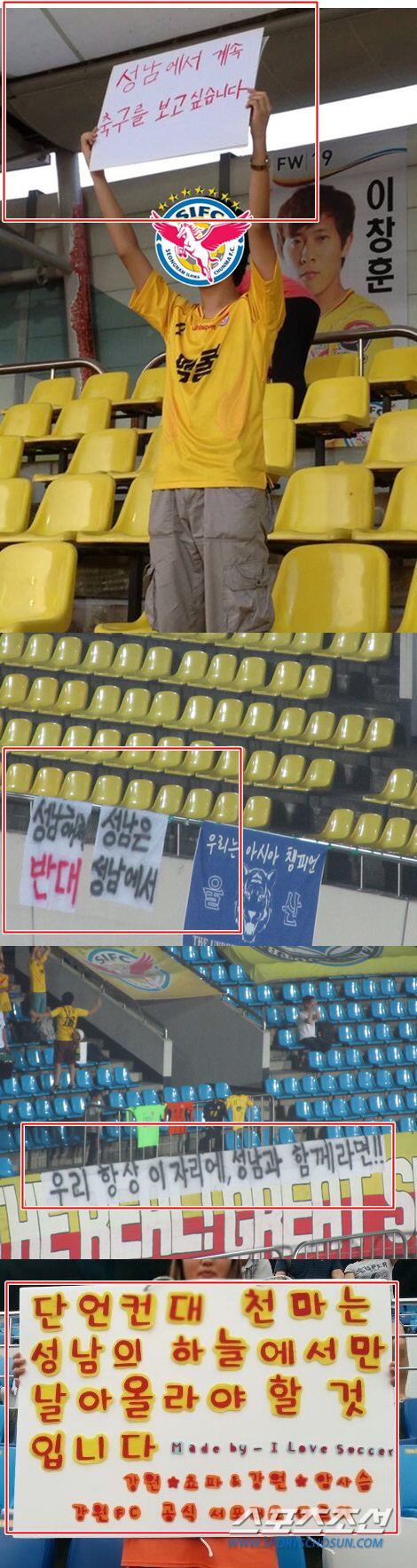 24일 성남 탄천종합운동장에는 평소보다 2배가까이 많은 3831명의 관중이 결집했다. 14년간 당연시 생각해왔던 '성남의 축구단'이 사라질 수도 있다는 위기감은 선수단과 팬들을 하나로 똘똘 뭉치게 했다. 성남 서포터스는 '우리 항상 이자리에, 성남과 함께라면'이라는 걸개를 내걸었다. 상대팀인 울산 서포터들도 '성남 해체 반대' '성남은 성남에서'라는 문구로 지지와 응원의 뜻을 보냈다. 같은날 대전전을 치른 강원 서포터스 '나르샤'도 동참했다. '단언컨대 천마는 성남의 하늘에서만 날아올라야 할 것입니다'라는 플래카드를 든 채 유명 축구게시판에 인증샷을 찍어올렸다.