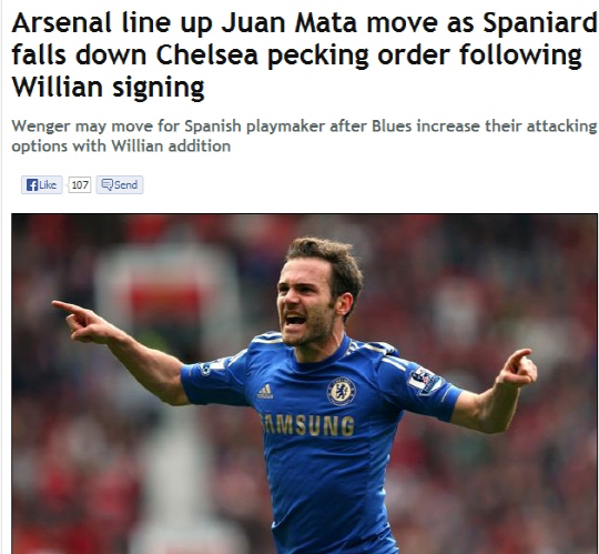 25일(한국시각) 영국 주간지 선데이피플은 아스널이 팀내 입지가 급격히 약해진 마타의 상황을 주시하고 있다고 보도했다. 2011년 2350만파운드에 첼시 유니폼을 입은 마타는 곧바로 잉글랜드 프리미어리그 최고의 미드필더로 자리매김했다. 그러나 조제 무리뉴 감독 부임 후 상황이 달라졌다. 무리뉴 감독은 마타가 팀의 핵심 선수라고 했지만, 마타는 최근 경기에서 선발명단에 제외되는 모습을 보이고 있다. 여기에 첼시는 비슷한 타입의 윌리안 영입에 사실상 성공해, 마타의 자리가 더욱 줄어든 상황이다.