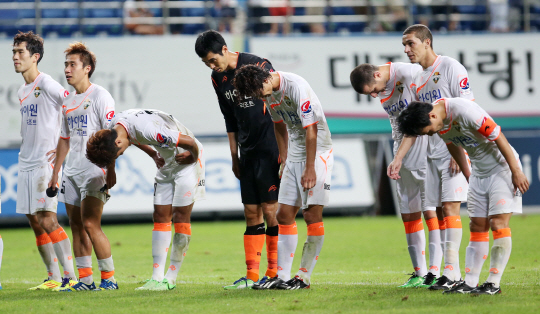 | ◇강원 선수단이 24일 대전월드컵경기장에서 가진 대전과의 2013년 K-리그 24라운드에서 0대2로 패한 뒤 팬들에게 인사하고 있다. 사진제공=강원FC |