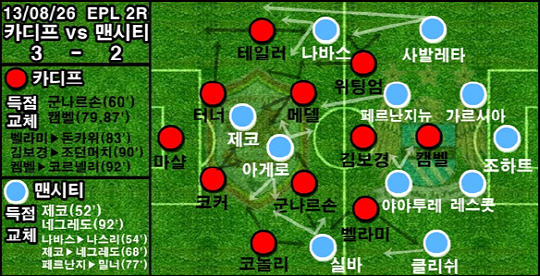 '맨시티'라는 엄청난 월척을 낚아 올렸다. 지난주 웨스트햄 원정에서 노란색 유니폼을 입고 우왕좌왕하던 그 팀이 맞나 싶었다. 맥케이 감독이 '쾌속 해동' 버튼이라도 누른 걸까. 잔뜩 얼어있던 카디프의 잠재력이 피치 위에 쏟아져 나온 건 그저 놀라웠다. 올 시즌 종료 시점의 운명은 커녕 당장 다음 주에 있을 3라운드 결과도 예측할 수 없는 노릇이다. 다만 확실한 건 맨시티를 3-2로 집어삼키며 일주일 새 확연히 달라진 그들의 행보가 13-14시즌의 상당히 흥미로운 관전 포인트가 되리란 점이다.
