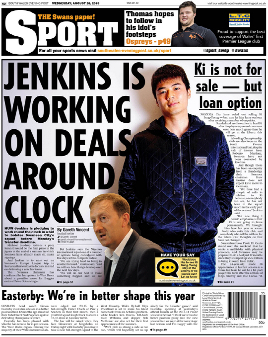 영국 웨일스 유력지가 기성용을 전면에 내세우면서 그의 이적이 팀의 핫이슈로 부각되고 있음을 나타냈다.