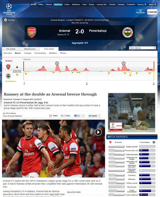 | 아스널이 램지의 2골로 페네르바체에 승리했다. 사진캡처=UEFA홈페이지 |