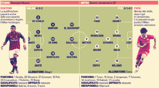 홈팀 밀란은 발로텔리, 엘 샤라위, 보아탱 3각 편대가 이에 맞선다. 이 중 컨디션이 가장 좋은 보아탱이 핵심 선수로 꼽히고 있다.