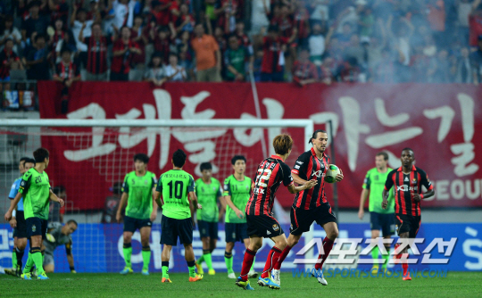 28일 상암동 서울월드컵경기장에서 K리그 클래식 25라운드 FC서울과 전북현대의 경기가 열렸다. FC서울 데얀이 후반 16분 동점골을 성공시키고 동료들과 함께 기뻐하고 있다. 상암=송정헌 기자 songs@sportschosun.com