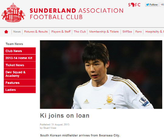 잉글랜드 프리미어리그(EPL) 선덜랜드가 기성용(24) 영입을 공식 발표했다.