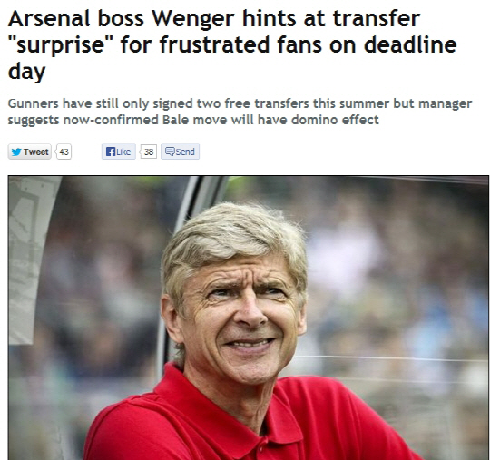 벵거 감독은 2일(한국시각) 토트넘과의 북런던더비를 승리로 이끈 후 "우리에게는 24시간이 있다. 우리는 팬들을 놀라게 할 수 있다. 아닐수도 있지만, 나는 확신한다"고 했다. 아스널은 올여름 대대적인 투자를 약속했지만, 야야 사노고와 마티유 플라미니 두명의 자유계약 영입에 그쳤다. 곤살로 이과인, 웨인 루니, 루이스 수아레스, 요앙 카바예 영입 모두 실패로 돌아갔다. 팬들의 불만은 돈이 있다면서 쓰지 않는 벵거 감독에게 모아졌다. 벵거 감독은 "나는 돈을 쓰는 것에 반대하지 않는다. 나는 우리 스쿼드에 슈퍼 퀄리티의 선수를 더하길 원할 뿐이다"고 했다.